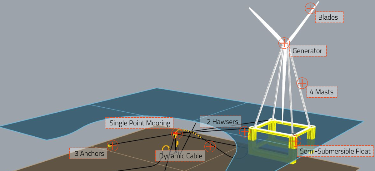 Hệ thống có công suất 5 MW này sẽ nặng 1.100 tấn, với mặt đáy hình vuông mỗi cạnh 52 m. Bản thân cánh quạt sẽ có đường kính 143 m. Eolink cho biết thiết kế của họ sẽ sử dụng thép ít hơn 30% so với cánh quạt truyền thống cho cùng một sản lượng định mức.